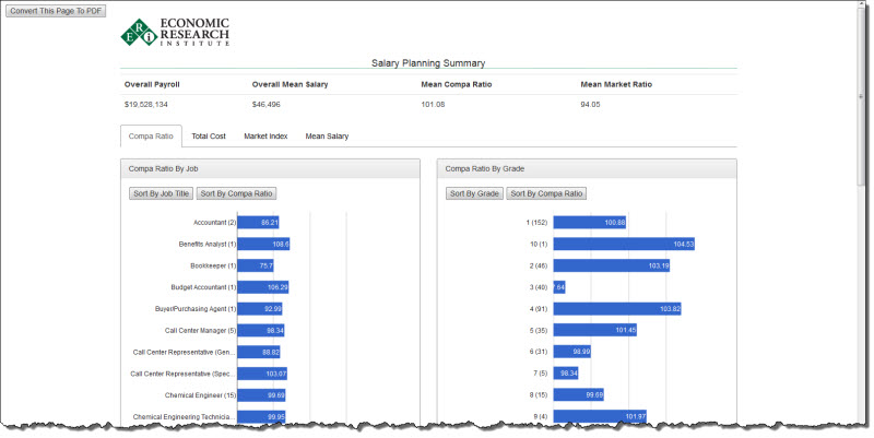 In Salary Planning, users can create and export a Salary Planning Summary that graphically reports Compa Ratio, Total Cost, Market Index, and Mean Salary by Job, Department, Pay Grade, and Location.