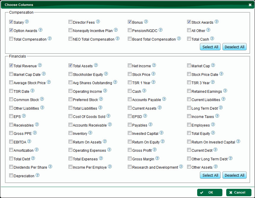 3.To remove a column, uncheck the box next to a specific term listed under Compensation or Financials OR click the Deselect All button.