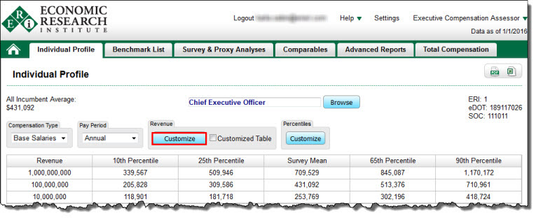 ERI collects data with the use of two-dimension tables. For executive jobs, compensation is compared against the size of an organization (reflecting the fact that larger organizations pay their management more because of their greater responsibilities).