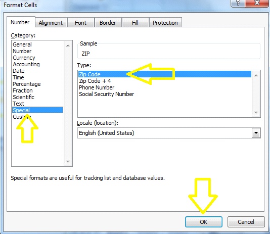 3.In the Format Cells dialog, choose the “Special” format category. The ZIP Code format is the default selection so leave it highlighted (see Figure 2).