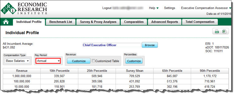 From the Individual Profile table, click on the drop-down menu below Pay Period and select a pay period (the default is Annual).