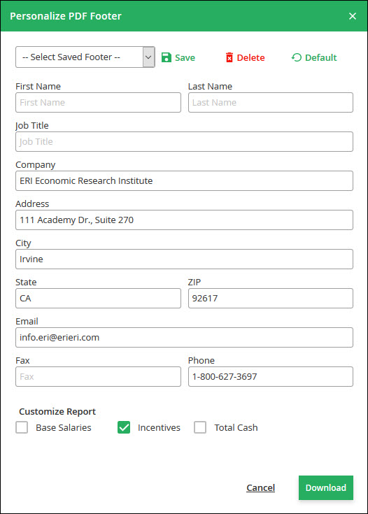 5.If you would like to include ERI's contact information as a footer at the bottom of each page of your report, click the Default button. Please note, you cannot include both ERI's contact information and your own organization specific information (only one is allowed).