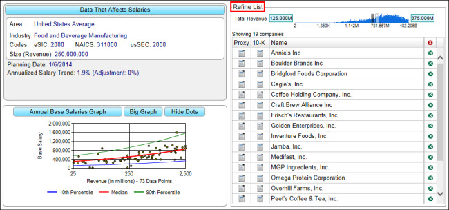Please note: The list of comparable companies displayed in the Refine List window includes those companies with an organization size (e.g., revenue) inside the limits set on the range slider and matches the companies list displayed in the Valuations screen or the Customize Executives screen in the Comparables tab (depending on the edition). Changing the minimum or maximum organization size using the range slider only affects the number of companies in the list; it does not affect the organization size selected in the Salary Adjustments dialog or the dots displayed on the graph. Changing the organization size in Salary Adjustments impacts two things: (1) it modifies what is shown in the graph, and (2) it adjusts the range slider by setting the end points to 50% below and 50% above the organization size selected in Salary Adjustments. Changing the organization size in Salary Adjustments only affects the comparable company list so far as it modifies the minimum and maximum settings in the revenue slider.