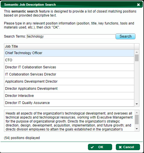 The Semantic Search is designed to provide a list of closest matching positions based on provided descriptive text.